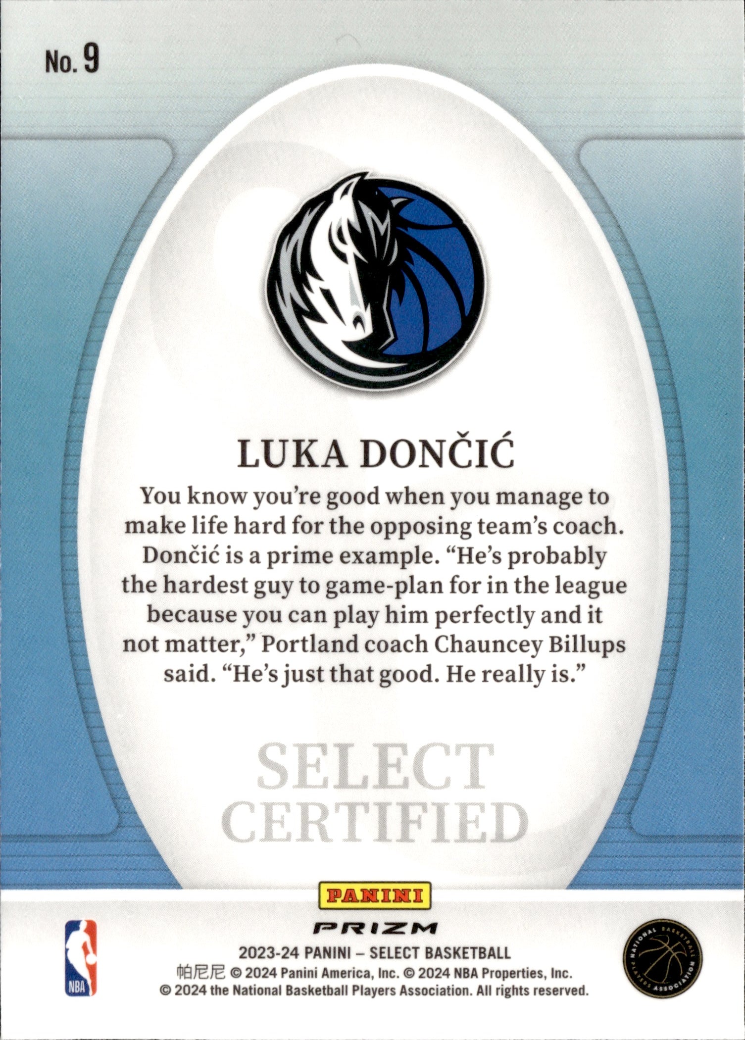 Luka Doncic Select Certified No.9 2023-24 Panini Prizm Select